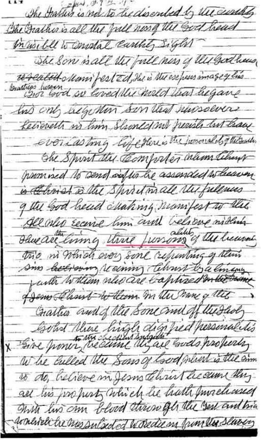 “There are the living thre personsalities of the heavenly trio in which every soul repenting of their sins believing receiving Christ by a living Faith to them who are baptized.”