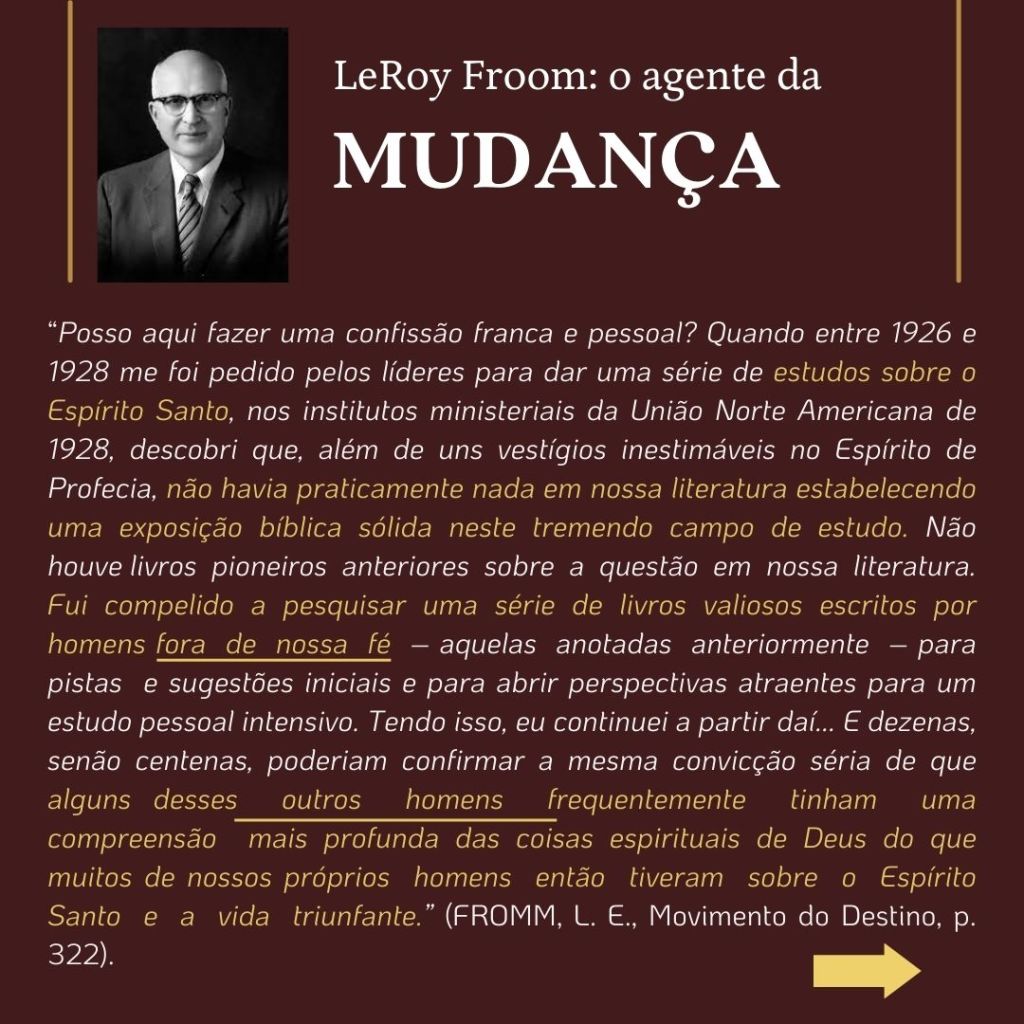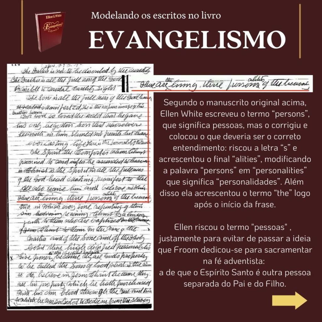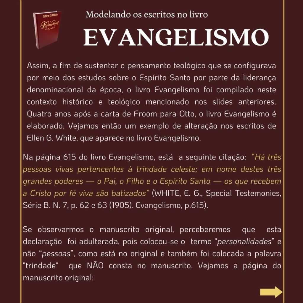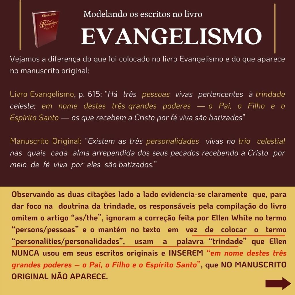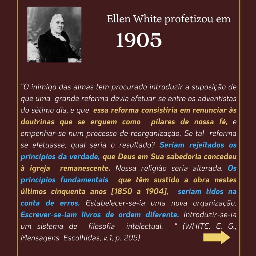 “O inimigo das almas tem procurado introduzir a suposição de que uma grande reforma devia efetuar-se entre os adventistas do sétimo dia, e que essa reforma consistiria em renunciar às doutrinas que se erguem como pilares de nossa fé…. Se tal reforma se efetuasse, qual seria o resultado? Seriam rejeitados os princípios da verdade… nossa religião seria alterada. Os princípios fundamentais que têm sustido a obra nestes últimos cinquenta anos [1850 a 1904], seriam tidos na conta de erros. Estabelecer-se-ia uma nova organização. Escrever-se-iam livros de ordem diferente. Introduzir-se-ia um sistema de filosofia intelectual.” (WHITE, E. G., Mensagens Escolhidas, v. 1, p. 205)