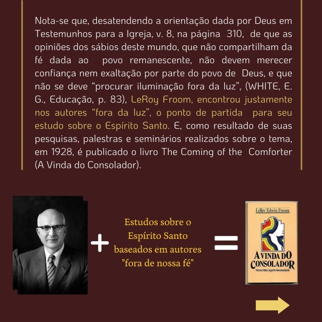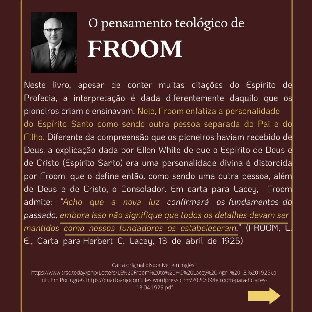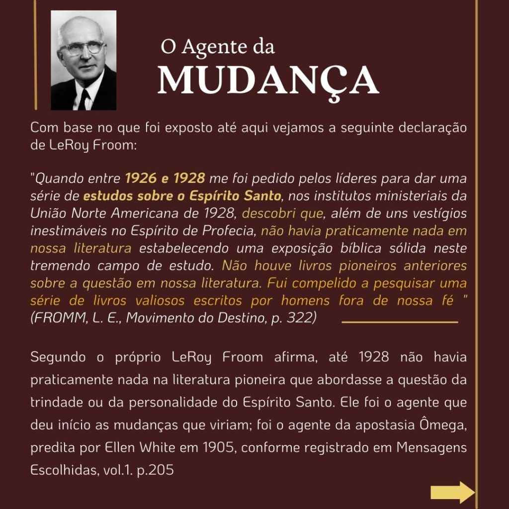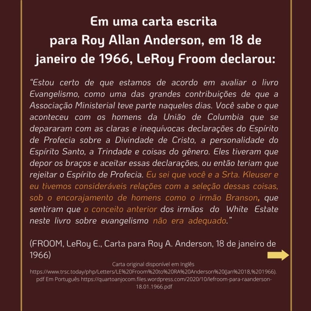 “O inimigo das almas tem procurado introduzir a suposição de que uma grande reforma devia efetuar-se entre os adventistas do sétimo dia, e que essa reforma consistiria em renunciar às doutrinas que se erguem como pilares de nossa fé…. Se tal reforma se efetuasse, qual seria o resultado? Seriam rejeitados os princípios da verdade… nossa religião seria alterada. Os princípios fundamentais que têm sustido a obra nestes últimos cinquenta anos [1850 a 1904], seriam tidos na conta de erros. Estabelecer-se-ia uma nova organização. Escrever-se-iam livros de ordem diferente. Introduzir-se-ia um sistema de filosofia intelectual.” (WHITE, E. G., Mensagens Escolhidas, v. 1, p. 205)