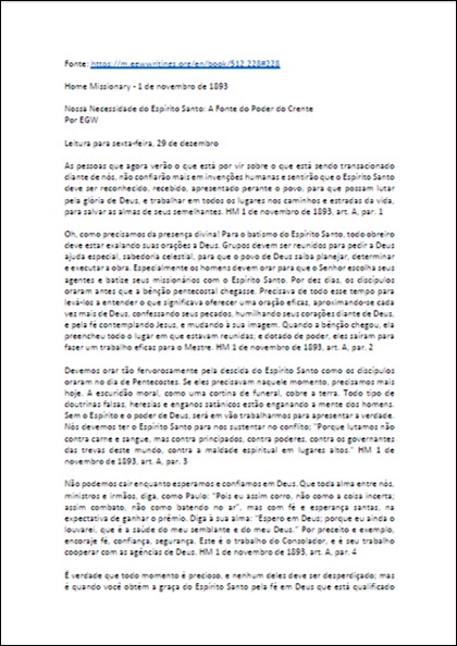 Missionário do Lar, 01/11/1893 – Ellen White “Nossa Necessidade do Espírito Santo: a Fonte do Poder do Crente”Download