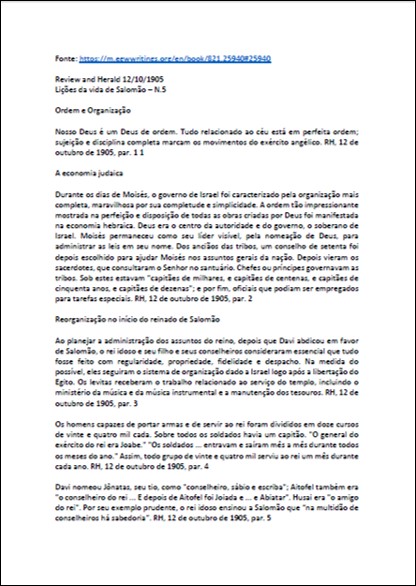 “Quando o homem vier mover um alfinete do nosso fundamento o qual Deus estabeleceu pelo seu Santo Espírito, deixe os homens de idade que foram os pioneiros no nosso trabalho falar abertamente, e os que estiverem mortos falem também, reimprimindo os seus artigos das nossas revistas. Juntemos os raios da divina luz que Deus tem dado, e como Ele guiou seu povo, passo a passo no caminho da verdade. Esta verdade permanecerá pelo teste do tempo e da experiência.” (Manuscript Releases, vol. 1 [Nos. 19-96]).