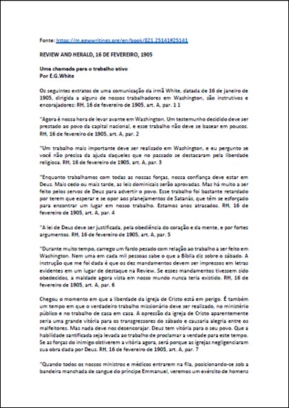 RH, 16/02/1905 – Ellen G. White “Uma Chamada Para o Trabalho Ativo”