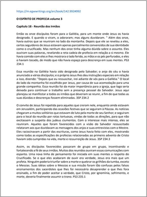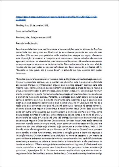 Artigo completo onde se encontra a seguinte declaração: “Convidamos todos a comparar os testemunhos do Espírito Santo através da Sra. W., com a palavra de Deus. E nisto não convidamos você a compará-los com seu credo. Isso é outra coisa. O trinitário pode compará-los com seu credo e, por não concordar com ele, condená-los.”Download