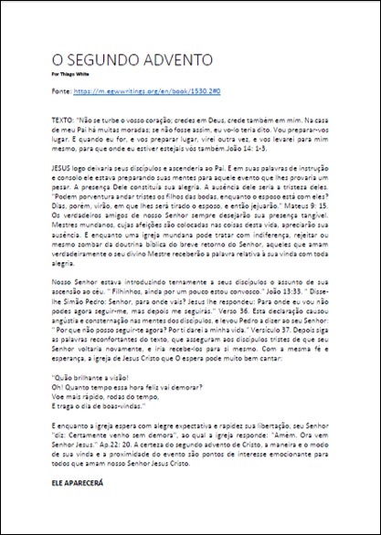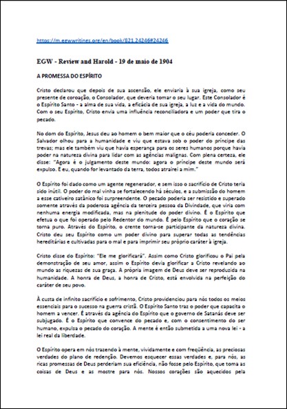 Artigo completo onde se encontra a seguinte declaração: “Cristo diz que após sua subida ele enviaria a sua igreja como o seu glorioso presente, o Confortador, que tomaria o Seu lugar. Este confortador é o Espírito Santo – a alma de Sua vida, a eficácia de Sua igreja, a luz e a vida do mundo. Com Seu Espírito Cristo enviaria uma influência reconciliadora e um poder que arranca o pecado.”Download