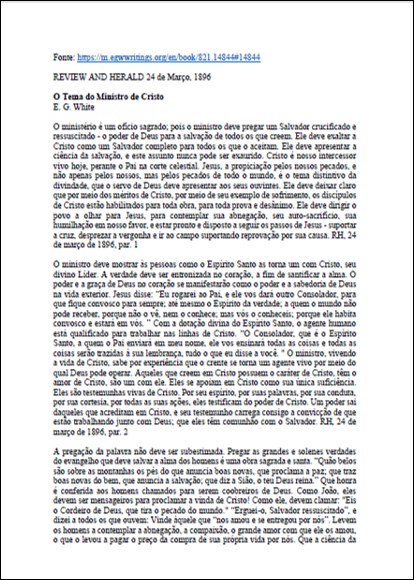 RH, 24/03/1896 – Ellen G. White “O Tema do Ministro de Cristo”