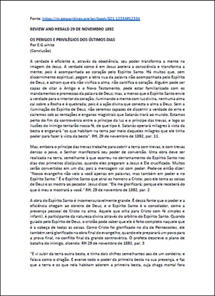 RH, 29/11/1892 – Ellen G. White “Os Perigos e Privilégios dos Últimos Dias”