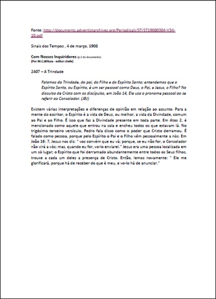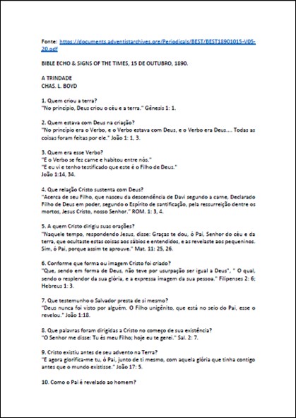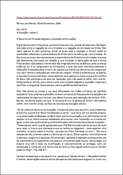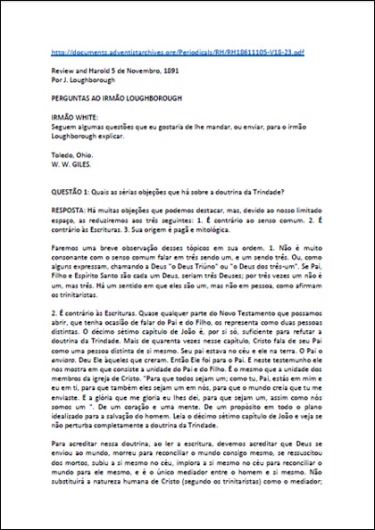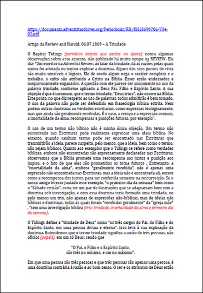 Artigo completo onde se encontra a seguinte declaração: “Como podemos traçar essa doutrina [trindade] não mais do que a origem do “Homem do Pecado” e como encontramos esse dogma naquele tempo estabelecido mais pela força do que de outra forma, reivindicamos o direito de investigar o assunto e averiguar o conteúdo da Escritura sobre este assunto.“Download