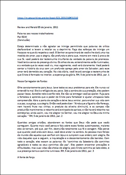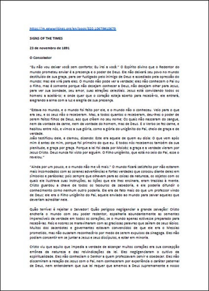 Artigo completo onde se encontra a seguinte declaração: “A razão porque as igrejas estão débeis e fracas e prontas para a morte é que o inimigo trouxe influências de uma natureza desencorajadora para repousar sobre as almas temerosas. Ele procurou tapar Jesus da visão deles como Consolador, como o único que reprova, que adverte, que admoesta dizendo ‘Este é o caminho andai por ele.”Download