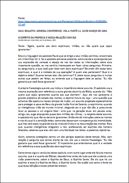 BOLETIM DA CONFERÊNCIA GERAL , V. 4, PARTE 11, 18/03/1891 – “O Espírito de Profecia e Nossa Relação com Ele” – Urias Smith