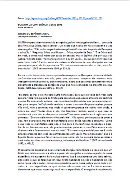 BOLETIM DA CONFERÊNCIA GERAL, 1895, 27/12/1895 – “Cristo e o Espírito Santo” – W. W. Prescott Download