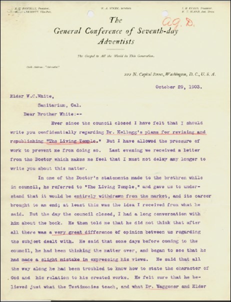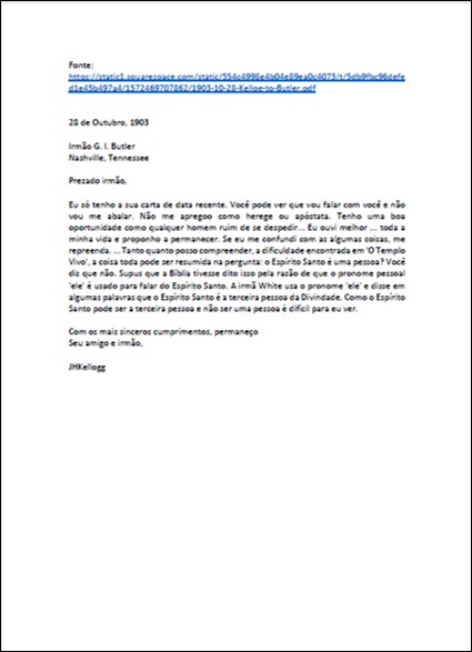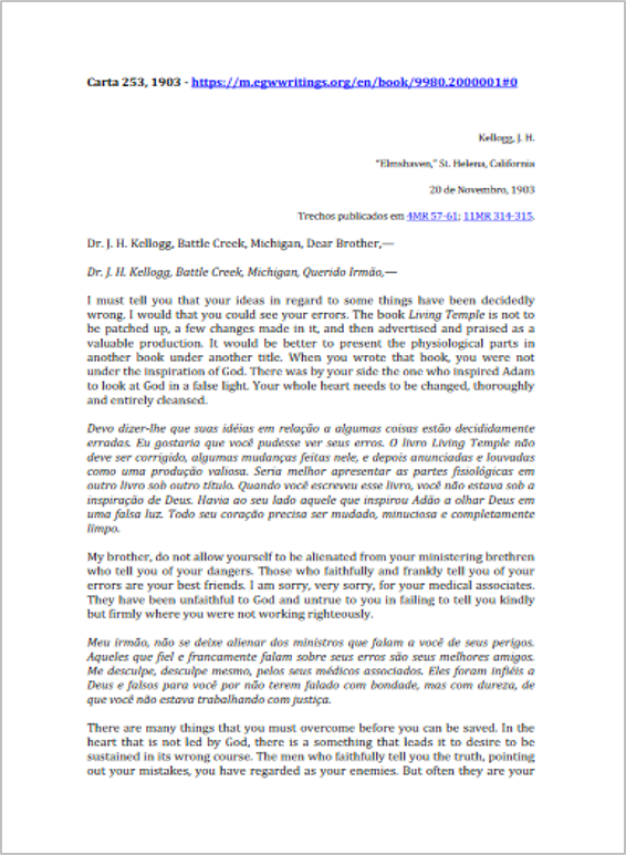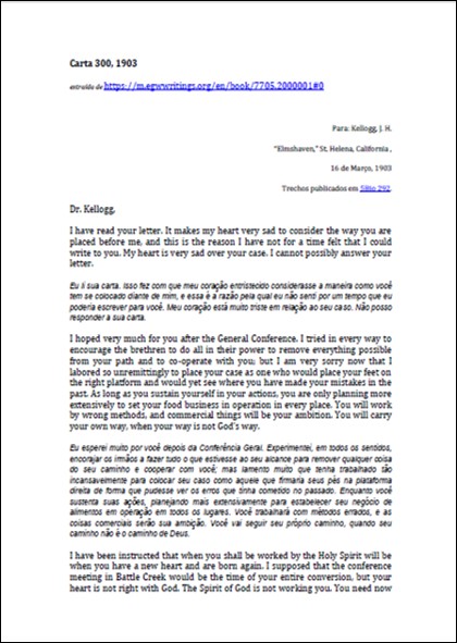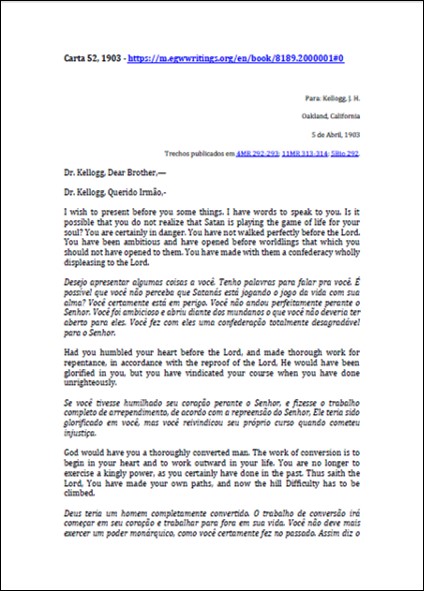 Assunto: advertências à Kellogg sobre suas falsas teorias, sobre seu afastamento da fé e sobre a influência satânica contida em suas ideias.Download