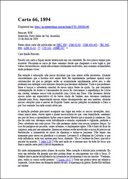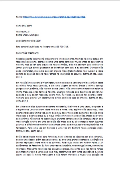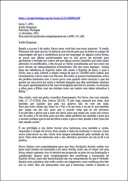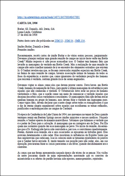 Assunto: carta contendo reprovação às teorias de Kellogg e a seguinte declaração: “eu estou na plataforma da verdade eterna – a mesma verdade que Deus deu aos pioneiros da mensagem do terceiro anjo, ponto a ponto, através de um estudo da Palavra, sob a orientação do Espírito Santo. Eu lhes dei a verdade como Deus me deu – verdade que tem sido a luz e a segurança de Seu povo no último meio século [1850 até 1906]”.Download