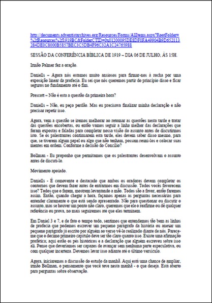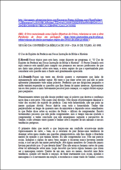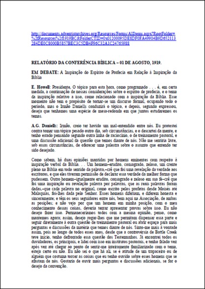 CONFERÊNCIA BÍBLICA 1919 – 30/07/1919 – Em debate: “O Uso do Espírito de Profecia em Nossa Instrução de Bíblia é História”Download