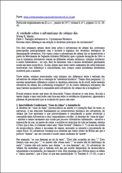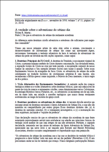 Revista Eternity Magazine, Janeiro de 1957 – “A Verdade Sobre os Adventistas do Sétimo Dia” – Por Walter R. Martin – “Parte 3: Teologia Adventista vs. Cristianismo Histórico”