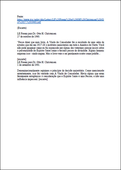 Assunto: sobre oposição de alguns irmãos adventistas à LeRoy Froom com relação ao seu livro “A Vinda do Consolador” e a sua defesa trinitária de que o Espírito Santo é a terceira pessoa da divindade/trindade.Download