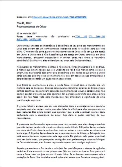 MANUSCRITO 44, 13/05/1897 – “Representantes de Cristo” – Neste manuscrito se encontra a seguinte declaração: “O Espírito Santo está