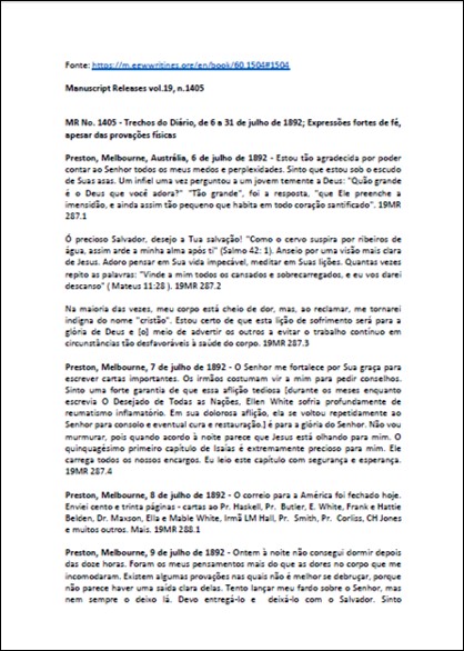 MR, vol. 19, N. 1405 – Ellen White “Trechos do Diário, de 6 a 31 de Julho de 1892; Expressões fortes de fé, apesar das provações físicas.”
