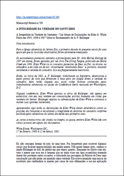 MR, N. 760 – Ellen White “A Integridade da Verdade do Santuário”