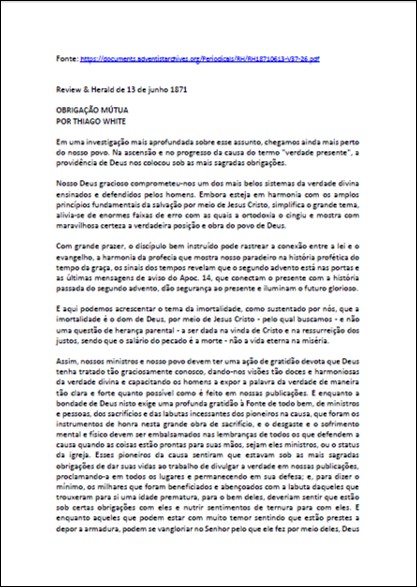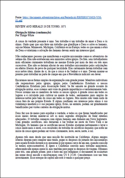 RH, 13/06/1871 – Thiago (James) White “Obrigação Mútua” – parte 1