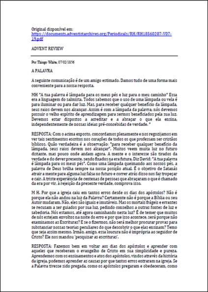 RH, 07/02/1856 – Thiago (James) White “A Palavra”