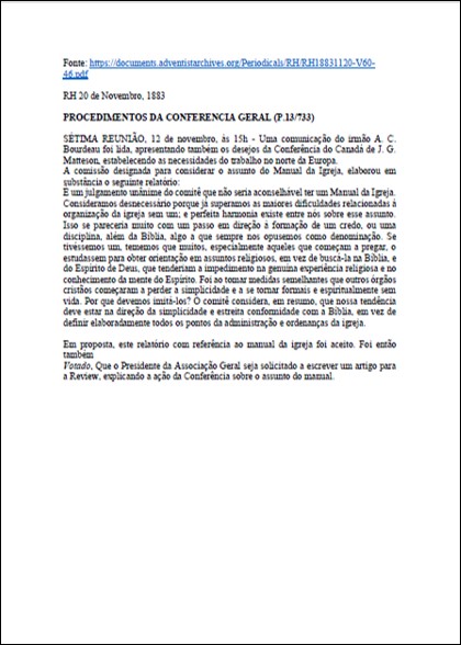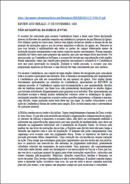 Artigo escrito pelo presidente da Conferência Geral em 1883 , explicando a ação da Conferência sobre a não aceitação de se ter um Manual da Igreja.Download