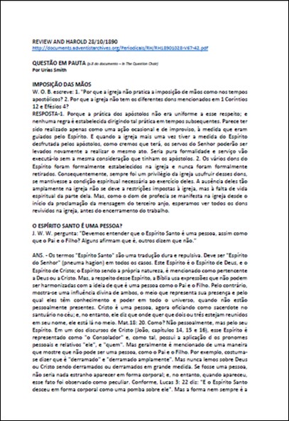 RH, 28/10/1890 – Uriah Smith “Questão em Pauta” (p. 8 do documento – In The Question Chair)