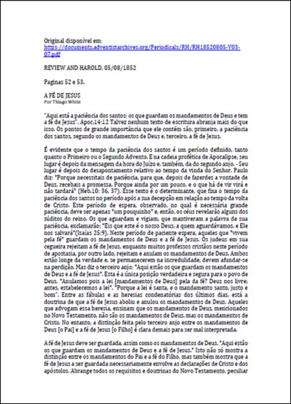 RH, 05/08/1852 – Thiago (James) White “A Fé de Jesus”