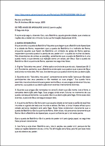 RH, 06/03/1855 – J. N. Andrews “Os Três Anjos de Apocalipse 14:6-12 (continuação) O Segundo Anjo”