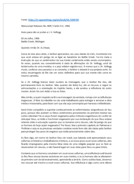 Assunto: carta contendo admoestação quanto às teorias de Kellogg e a seguinte declaração: “Por favor, leia o primeiro capítulo de Patriarcas e Profetas e veja se as preciosas verdades contidas neste livro não são dadas pelo Senhor para proteger Seu povo de enganos que estão precisamente sobre eles. Eu lhes digo, em nome do Senhor Deus de Israel, que Satanás está apresentando seus sofismas a ministros e trabalhadores médicos, e se nosso povo ouvir esses sofismas, eles ficarão impregnados pela mesma falsa ideia de uma religião popular que os fará se desenvolver em deuses, e não haverá lugar em suas vidas para Deus ou para Cristo.”Download