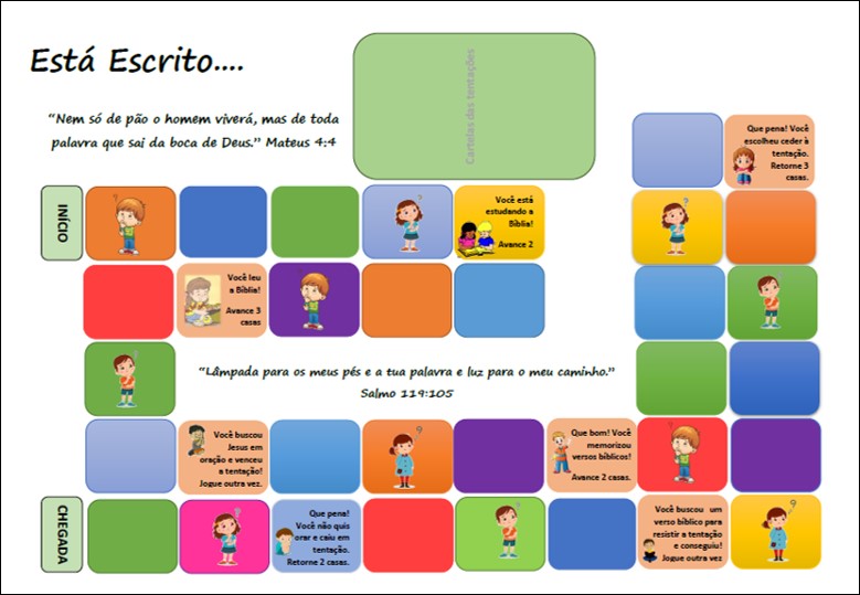 Jogo Bíblico Infantil “Está Escrito…” (um jogo educativo de estímulo às crianças e adultos para a memorização e uso de textos bíblicos como método de resistência às tentações de Satanás, assim como Cristo resistiu com o “Está Escrito”, conforme Mateus 4:1 a 11)Download